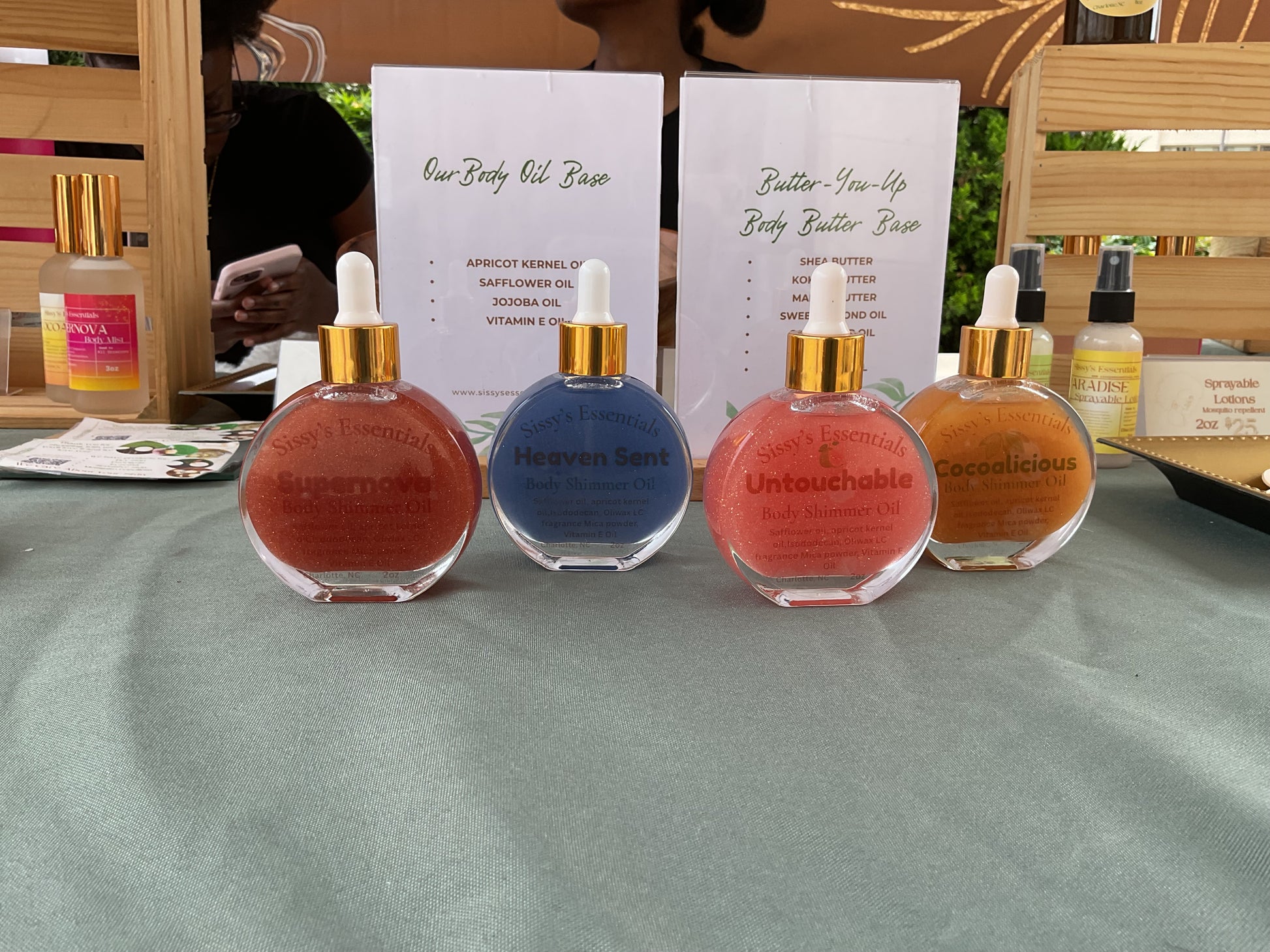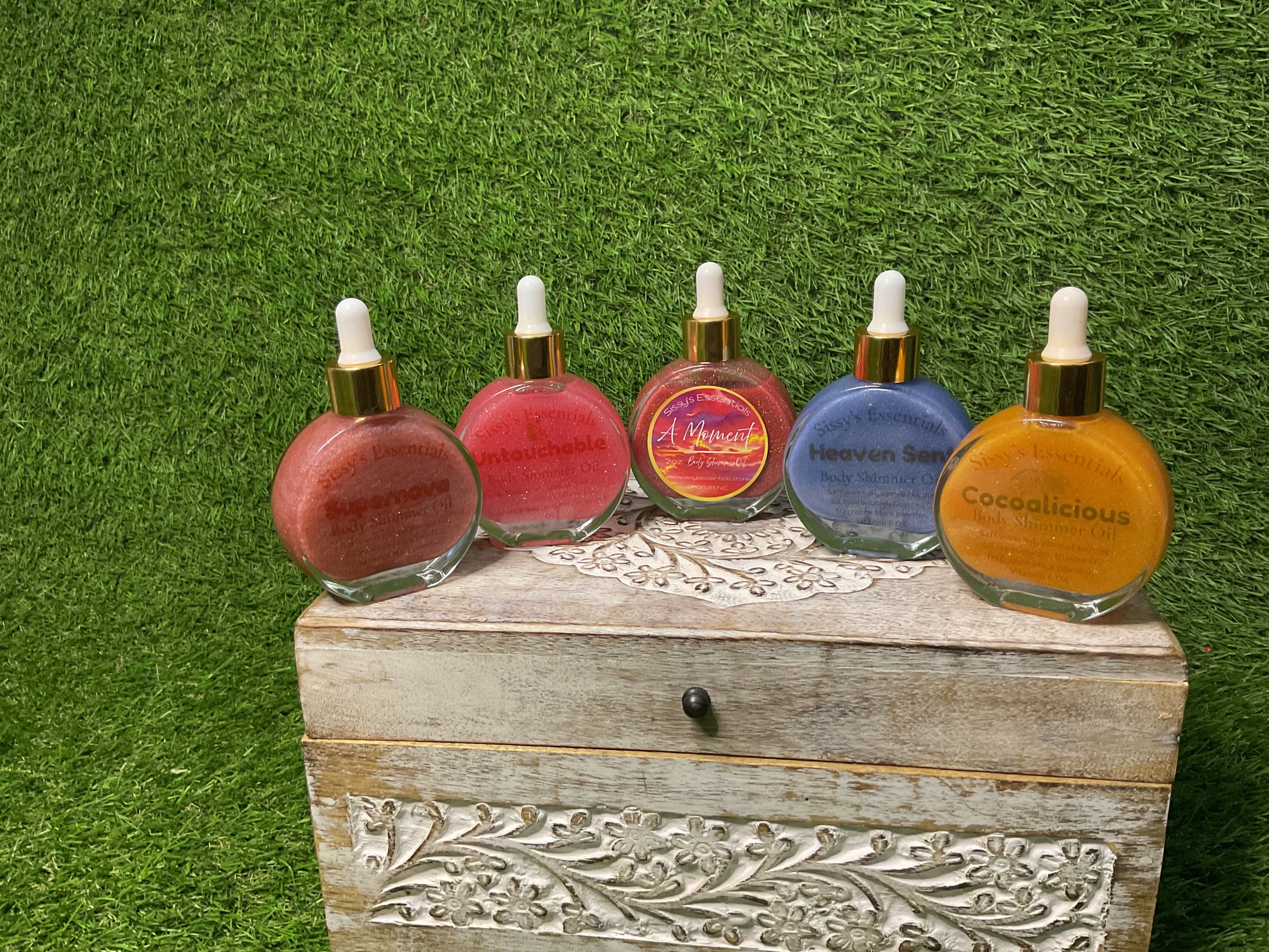 All Body Shimmer Oils contain a base of Apricot kernel oil and safflower oil.